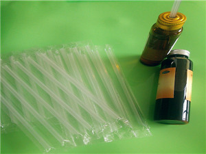 口服液吸管材質一般為PP或者PE。其特征是吸管的表面均勻分布著五至十二條棱,以八條棱為佳,這些棱與吸管口平面垂直立交,以便于穿透鋁箔吸口,使吸液暢順。口服液吸管與普通的表面圓滑的吸管相比,用起來更加方便。